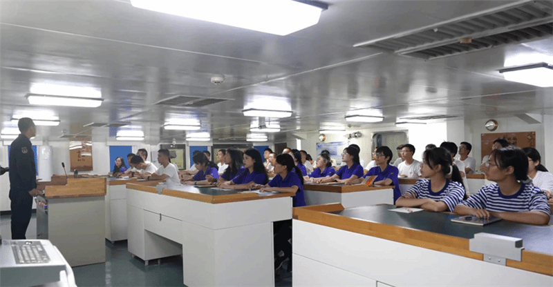 8月5日,实习队伍前往旅顺港登上郑和舰。来自海军大连舰艇学院的教员们就《舰艇安全管理》《海军知识》等内容讲述了丰富充实的理论课程。在教员的指导下,同学们对海洋环境、海洋安全、舰艇情况等相关海洋知识有了详细了解并产生了极大兴趣,纷纷表示获益匪浅。